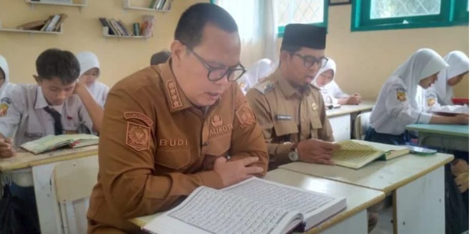 Budi Rustandi tampak duduk di barisan tengah kelas bersama siswa kelas IX sambil membaca Al-Quran surat Ali Imran. Ia didampingi Kepala Dinas Pendidikan dan Kebudayaan (Dindikbud) Kota Serang Ahmad Nuri.